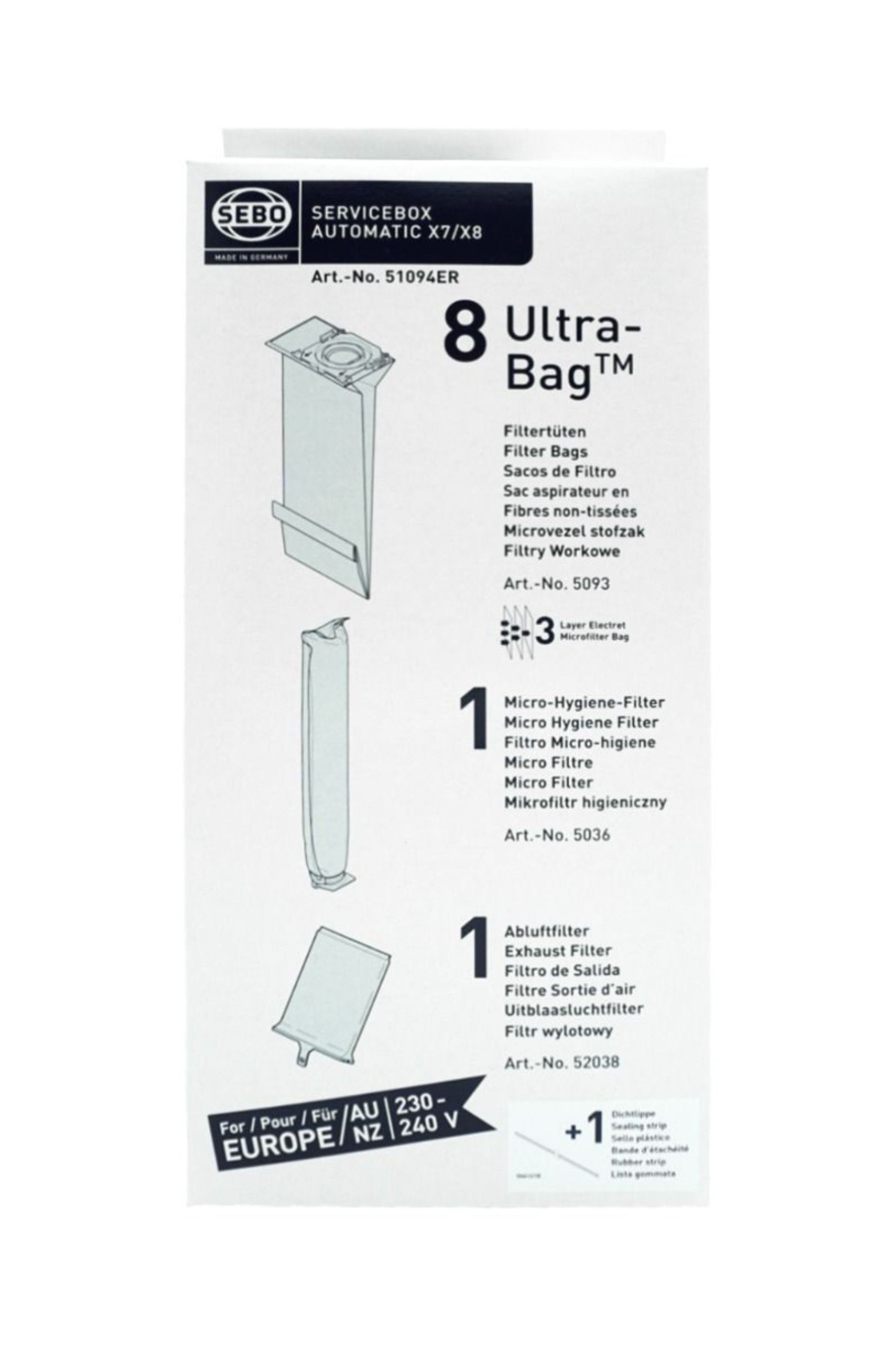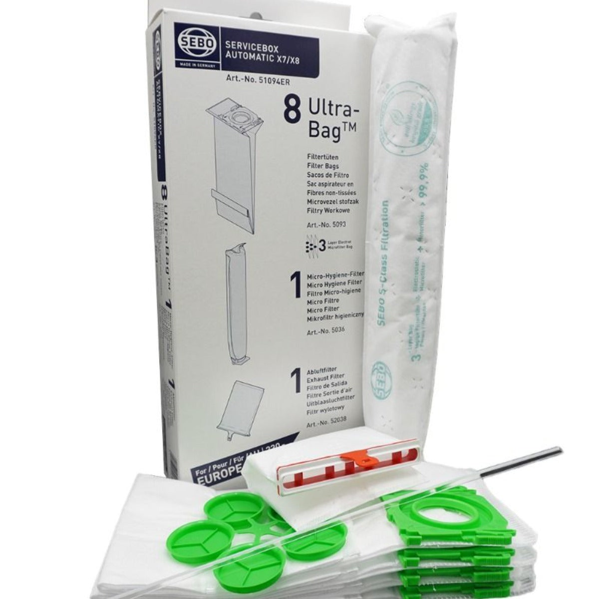 Regularly changing the filters prolongs the life of the machine and ensures optimum performance. The X Series Service Box contains 8 x Ultra-Bags, 1 x 5036ER Microfilter,1 x 52038ER Exhaust Filter and 1 x 54001 Sealing Strip.